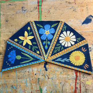 This four hour class teaches students the basics of how to create a hand painted nature-themed flag bunting. The focus of the class will be on painting multiples of the same design, creating five identical flags in a fun and efficient process