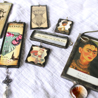 Ephemera Jewelry is a technique of pressing paper imagery between thin glass and soldering a frame on it with lead free solder. This is a unique craft and your finished pieces are sure to spark conversation.